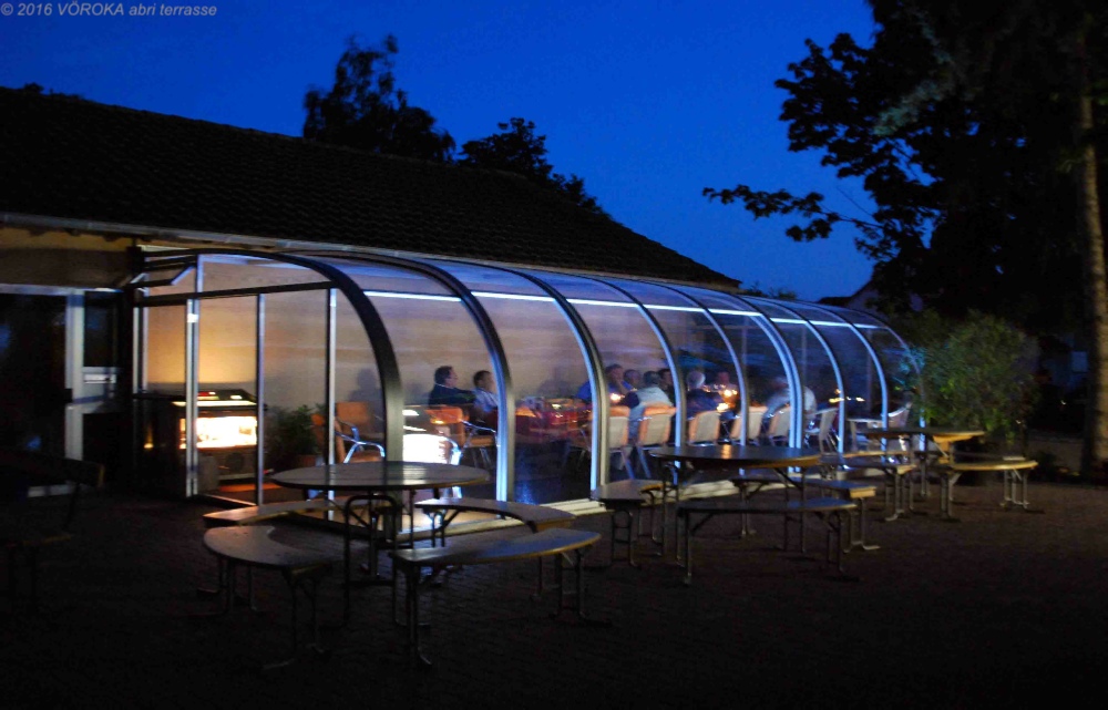 Les différents modules coulissent et permettent de profiter du plein air. La nuit est tombée et la soirée continue malgré la fraîcheur extérieur .