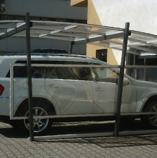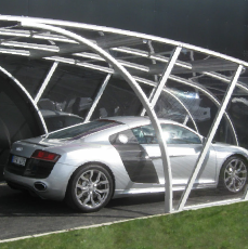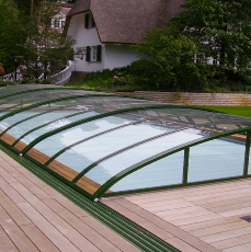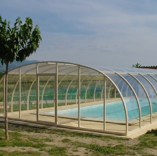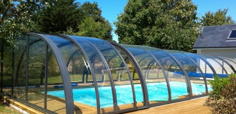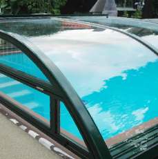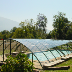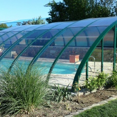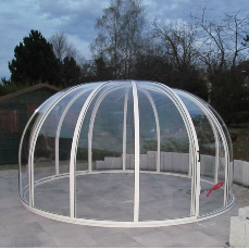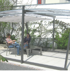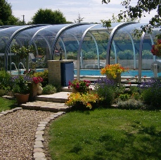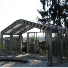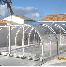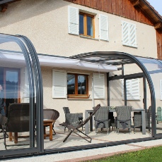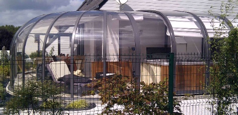 L’abri de terrasse placé sur un angle extérieur. Le 1/4 de rotonde réalise la jonction avec les deux abris Saphir
