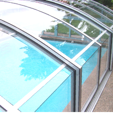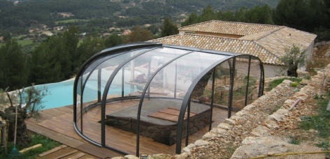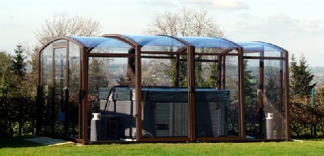 Abri de spa rectangulaire de forme angulaire. Structure coulissante avec motorisation en option.
